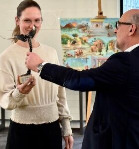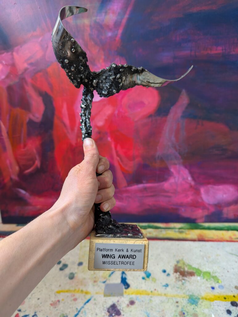 8 april 2026 | Tijdens de expositie van Platform Kerk en Kunst in Apeldoorn, in de Julianakerk werd de Wing-Award uitgereikt. Bijzonder leuk en bemoedigend om deze award in ontvangst te nemen! Tijdens de afsluitende bijeenkomst van de expositie was ik uitgenodigd om een artist talk te geven over mijn werk. (fotografie Reina Folkerts)